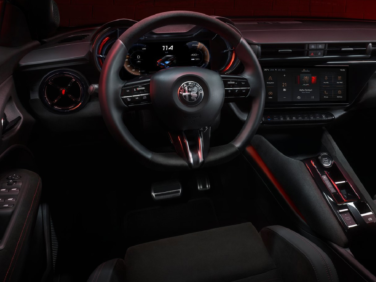 L'abitacolo dell'Alfa Romeo Junior offre spazio a sufficienza per quattro adulti; un po' sacrificato una quinta persona, sia per la larghezza non eccezionale sia per il tunnel nel pavimento. Riuscita la plancia realizzata con materiali di qualità e con il tradizionale cruscotto "a binocolo" in cui è inserito un chiaro schermo configurabile di 10,25". Stesse dimensioni per il display nella consolle, leggermente orientato verso il guidatore ma un po' in basso. Fra l'altro, per le versioni elettriche il navigatore suggerisce dove effettuare una sosta per la ricarica durante il viaggio, tenendo conto anche delle condizioni del traffico e dello stile di guida di chi è al volante. Una finezza le bochette di ventilazione circolari, illuminate e con il logo del Biscione. Meno convincenti l'aspetto dei pannelli in plastica dura per le porte e l'assenza delle maniglie di appiglio nel soffitto.