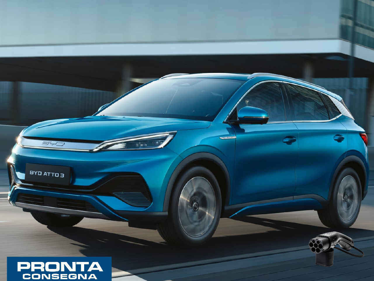 La BYD Atto 3 è una crossover elettrica di medie dimensioni a trazione anteriore; la produce il colosso cinese, la cui sigla deriva dalla frase Build Your Dreams ("costruisci i tuoi sogni"). Moderna ed equilibrata nelle linee, ha un abitacolo vistoso, con plancia "a onda", rivestimenti blu e bianchi con cuciture di colore rosso e un display centrale di 12,8" o di 15,6" (in base alla versione), che può ruotare di 90°, così da disporsi in verticale. Il sistema multimediale è valido (ma al lancio della vettura non era disponibile Android Auto, che dovrebbe arrivare con un aggiornamento successivo); i comandi del "clima" (solo monozona) sono in gran parte virtuali, cosa che non ne agevola l'uso. Su strada, si notano il notevole sprint garantito dai 204 cavalli e la morbidezza delle sospensioni: ottimo il comfort, ma ci sono troppe oscillazioni nella guida un po' decisa. La batteria, da 60 kWh e prodotta dalla stessa BYD, ha una composizione particolare (al litio-ferro-fosfato) che dovrebbe garantire una elevata capacità di evitare di incendiarsi; la ricarica, che può avvenire a un massimo di 88 kWh, non è però molto rapida: servono almeno 44 minuti per passare dal 10 all'80%. E l'autonomia dichiarata è discreta. Molto ricca in rapporto al prezzo è invece la dotazione, che include la guida semiautonoma, i sedili regolabili e riscaldabili elettricamente, e il tetto panoramico apribile.