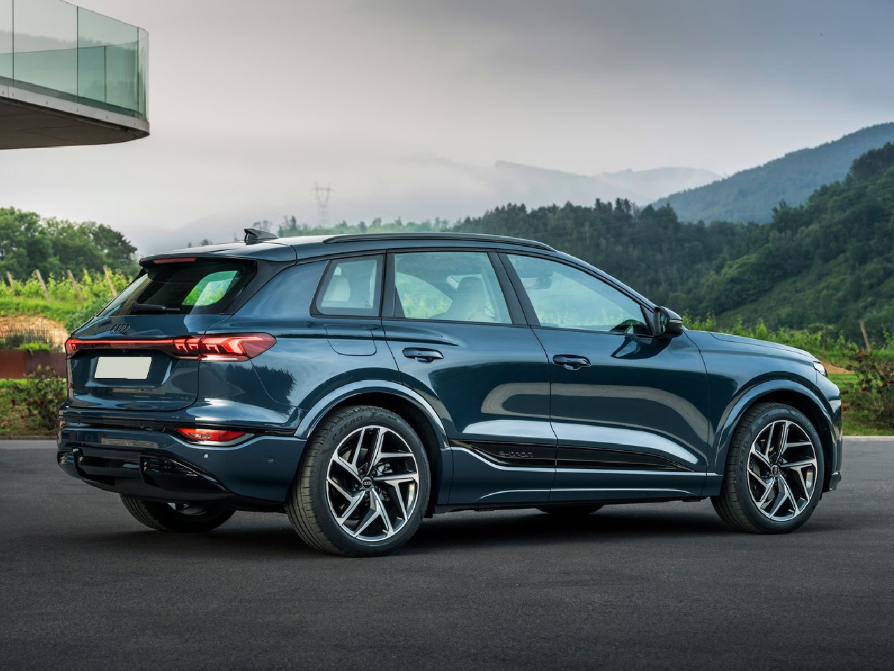 L’Audi Q6 e-tron è una suv elettrica di grandi dimensioni, costruita sulla piattaforma PPE per le auto a batteria del gruppo Volkswagen; la usa anche la Porsche Macan. Lo stile della Q6 e-tron riprende quello delle altre suv del marchio tedesco, che unisce linee morbide a elementi più aggressivi. Ha un frontale imponente, dominato da una grande griglia con finalità più che altro estetica, date le ridotte necessità di raffreddamento delle auto elettriche; le luci diurne, molto sottili, nelle versioni più ricche sono dotate di grafica personalizzabile. La nuova piattaforma ha consentito di ridurre gli sbalzi al minimo: nei passaruota trovano posto cerchi di 18”, che possono salire fino a 21” in base alle versioni. Dietro, il lunotto è piuttosto inclinato ed è sormontato da un vistoso spoiler che migliora l’aerodinamica.